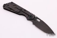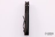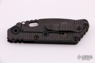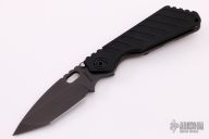 This Mick Strider SNG Fatty framelock folder features a black tanto blade with thumbhole and notched thumbrest. The handle has a black aluminum and flamed titanium frame with titanium clip, tip up carry. Jimping on blade spine. Nice lockup, detent, and blade seating. New from maker.