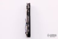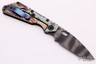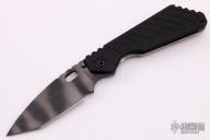 This Mick Strider SMF Fatty framelock folder features a tiger striped tanto blade with thumbhole and notched thumbrest. The handle has a black aluminum and ATACS Camo titanium frame with titanium clip, tip up carry. Jimping on blade spine. Nice lockup, detent, and blade seating. Has a couple scuffs, otherwise excellent condition.