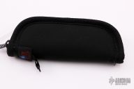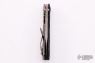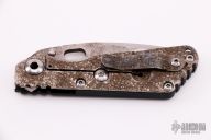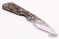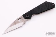 This Mick Strider SNG framelock folder features a wharncliffe blade with thumbhole and notched thumbrest, magma finished flats. The handle has a black G-10 and magma finished titanium frame with titanium clip, tip up carry. Jimping on blade spine. The G-10 has a cross hatch pattern. Nice lockup, detent, and blade seating. New from maker. Comes with a zippered case.