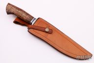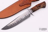 This bowie by Journeyman Smith Josh Fisher was the Winner of the Best Bowie at the Arkansas show. It features a San Mai Damascus blade with Damascus core, .195" blade stock and 1.735" blade depth, hidden tang construction. The handle has a stainless steel guard with a curly wood grip, Damascus and stainless steel spacers, single stainless steel pin. Comes with a brown leather sheath and zippered case. Excellent condition.