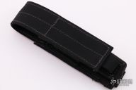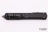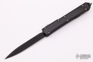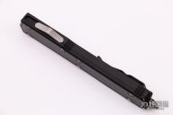 This Makora II by Microtech, (S/N 00312 07/2008) has a black double-edged blade with fullers. Handle is black aluminum with black carbon fiber overlays, bead blasted hardware and glass breaker, and stainless steel tip down clip. Has some wear on the clip, otherwise excellent condition. Comes with a black nylon sheath, original box and papers.