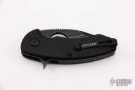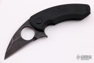 "The Silent Soldier Flipper features a black tumbled blade with a Wharncliffe style profile. The blade has a double ground, double swedge. The spine has aggressive thumb jimping and a 7/8" finger hole in the blade for ultimate control with various grip styles. The pivot utilizes a ball bearing system and heat treated pivot and stop pin. The handle has 6al4v titanium liners, G10 scales. Tip up pocket clip" Flipper opening mechanism. Comes with original box and papers. Excellent Condition.