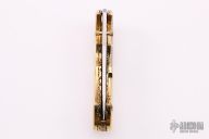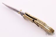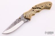 This knife features a satin finished blade with engraved flats and dual brass thumbstuds. The handle has engraved brass bolsters, scales and backspacer, fileworked brass liners. Nice lockup. Comes with a vault style case. Excellent condition.