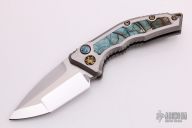 This Medusa Auto by Heretic Knives features a mirror polished tanto blade with false top edge and notched thumbrest. The handle has a hand rub satin finished titanium frame with mammoth ivory inserts, mammoth ivory push button, bronzed titanium backspacer and a tip up clip with ceramic ball. Comes with original box, COA and drawstring bag.  S/N 008. New from maker at the CCKS.