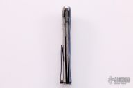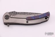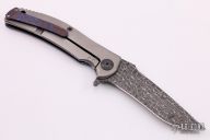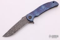 This Q36SS Flipper by RJ Martin features a Damascus blade with notched thumbrest and flipper. The handle has a timascus and blasted titanium frame with a timascus tip up clip, carbon fiber backspacer, and a textured zirconium pivot. Rides on bearings, nice detent, lockup and blade seating. Has stainless lockface insert and over travel stop. Comes with a zippered case. New from maker at the 2020 CCKS.