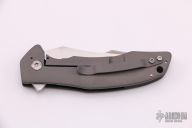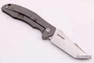 This T22 by Ed Cope has a satin finished tanto blade with flipper. This knife features a carbo quartz and bead blasted titanium frame with matching tip up clip and carbon fiber backspacer. Comes with a padded zippered case and COA dated Sept 30, 2020. Nice detent, lockup and blade seating. Rides on bearings. New from maker at the 2020 CCKS.