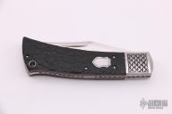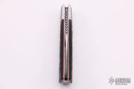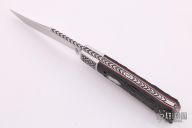 This Trapper by Bill Ruple features a hand rub satin finished blade with nail nick and engraved spine. The handle has engraved stainless steel bolsters and liners with jigged blackG10 covers with red liners, stainless steel escutcheon, fileworked spines of the liners and engraved spring done by Bill Ruple. Has half-stop, flush in all positions. Comes with a zippered case. New from maker.
