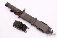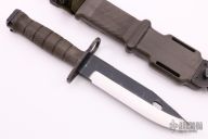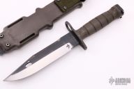The M9 Bayonet by Lan-Cay was reground by Borka Blades. It has a black blade with satin grinds, sawteeth on the spine and hole in the blade that corresponds with the tab on the sheath to act as a wire cutter, .235" blade stock and 1.452" blade depth, hidden tang construction. The handle has a steel guard and butt with green nylon grip. Comes with original sheath. Has some scratches, but that's the way the came to Borka when he reground them. New from maker at the CCKS. Comes with COA dated 2020.