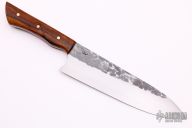 This Chef Knife by Rip Knives features a forged stainless steel blade with nice distal taper, hand rub satin finish with forged finished flats, .100" blade stock and 2.088" blade depth, full tang construction. The handle has ironwood scales with brass pins. Comes with a zippered case. New from maker at the CCKS.