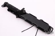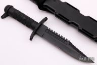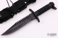 This Buckmaster 184 from Buck Knives has a black blade with a sharpened and serrated top edge, has sawteeth on spine, .288" blade stock and 1.461" blade depth, hidden tang construction and a hollow knurled handle. Includes original sheath. Has some light scuffs, otherwise excellent condition.