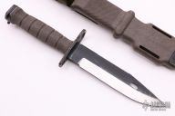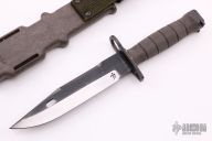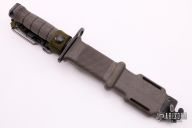The M9 Bayonet by Lan-Cay was reground by Borka Blades. It has a black blade with satin grinds, sawteeth on the spine and hole in the blade that corresponds with the tab on the sheath to act as a wire cutter, .235" blade stock and 1.452" blade depth, hidden tang construction. The handle has a steel guard and butt with green nylon grip. Comes with original sheath. Has some scratches, but that's the way the came to Borka when he reground them. Excellent condition.