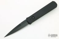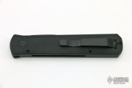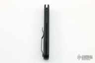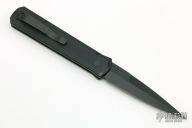 This knife features a black sterile blade. The handle has a black aluminum frame with black hardware and black stainless steel tip up clip. There is a lantern inlaid into the push button. Comes with original box and papers. New from maker.
