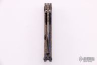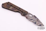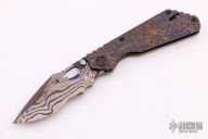 This PT framelock folder by Mick Strider features a Sole Authorship Damascus blade with notched thumbrest and a thumbhole. The handle has a carved and anodized titanium frame with lanyard hole. Nice detent, lockup and blade seating. Excellent condition. Comes with zippered case.