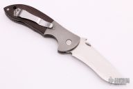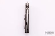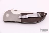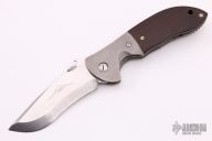 This custom Commander by Ernie Emerson features a hand-ground satin finished chisel ground recurve blade, dovetailed bead blast titanium bolsters and liners, green canvas micarta scales, black G-10 backspacer, and tip up stainless steel clip. Thumbdisc, wave feature and notched thumbrest. Has been used and carried, has scuffs and scratches, otherwise good condition.