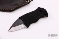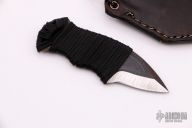 This Snuggler by Tracker Dan features a spear point blade with false top edge, .110" blade stock and .872" blade depth. The handle has black cord wrap. Comes with a brown leather sheath. Excellent Condition.