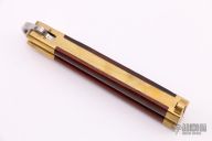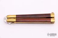 This Manilla Folder Balisong from Taylor/Seto features a satin finished spear point blade with false top edge. The handle is comprised of integral brass construction with rosewood inlays. Brass T latch on pommel. Includes the original box. Has some scratches, otherwise excellent condition.