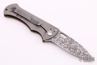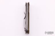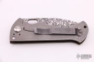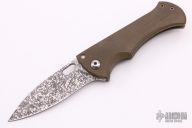 This Tracker Dan Bloodshark by John Gray is a collaboration with Tracker Dan, it features a splatter finished blade with thumbhole. The handle has a green canvas micarta and bark finished titanium frame, spiral barked stainless steel pivot, barked tip up stainless steel clip.  New from maker at the CCKS.