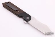 This linerlock flipper by Billy Cho Knives features a satin finished chisel ground tanto blade with a notched flipper. The handle has black canvas micarta bolsters, brown canvas micarta scales, bead blasted titanium liners, orange peel finished zirconium backspacer and tip up clip. Nice detent, lockup and blade seating, rides on bearings. Excellent condition.