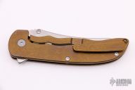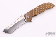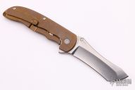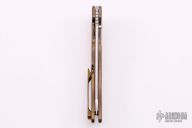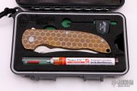 This Norseman (#4079) by John Grimsmo features a stonewashed blade with a single anodized titanium thumb stud, notched thumb ramp and flipper. Anodized titanium frame with a reverse honeycomb pattern front scale and titanium screws. Very smooth action that requires no wrist movement. Nice detent, lockup and blade seating. Rides on ceramic bearings. Knife is in excellent condition, shows no signs of use or carry. Comes with original packaging, custom hard case, Nano-Oil, tool, and COA.
