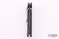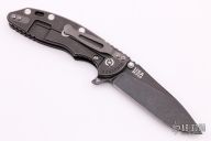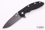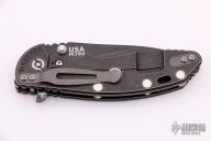 This XM-18 from Rick Hinderer features a battle black slicer blade, .165" thick blade. The handle has a black G-10 scale and a battle black titanium frame, barrel spacers and pocket clip. Dual thumb studs and notched thumbrest. Reversible pocket clip. Strong lock up, nice detent and blade seating is center. Comes in the original packaging. Excellent condition. Has Tri-way pivot and extra hardware.