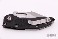 This Stitch Auto by Microtech Knives features an stonewash finished blade and false top edge, notched thumb and finger rests. The handle has a black anodized and milled aluminum handle with a bead blasted titanium backspacer and a bead blasted stainless steel clip, tip up carry, lanyard hole at the butt. Comes with original box and papers. S/N of 5066 and dated 10/2020. Excellent condition.
