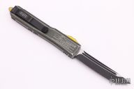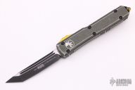 This Ultratech OTF automatic by Microtech features a T/E black tanto blade. Distressed OD Green aluminum contoured frame with black hardware, yellow thumbslide and glass breaker. Dated 08/2020 and s/n 27. Excellent condition. Comes with original box and papers.