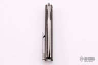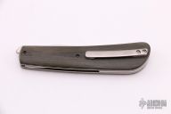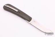 This Moose Front Flipper by Jason Clark features a hand rub satin finished S45VN blade with a notched front flipper. The handle has green linen micarta scales, orange peel finished titanium liners, satin finished floating stainless steel backspacer, tip up orange peel finished titanium clip. Rides on IKBS, nice detent, lockup and blade seating. Comes with a leather slip sheath and COA. New from maker at the CCKS.