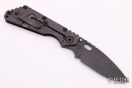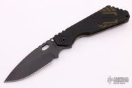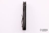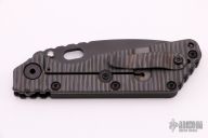This SMF by Mick Strider features a black blade with thumbhole and notched thumbrest. The handle has black aluminum and flamed titanium frame and tip up titanium clip, has black hardware and an anodized titanium lockbar stabilizer. Notches on thumbrest, rear of handle. Nice detent, blade seating and lockup. New from maker at CCKS.