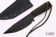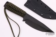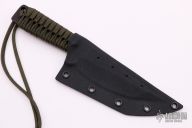 This knife by Mick Strider features a black blade with false top edge, .221" blade stock and 1.466" blade depth, full tang construction with paracord wrap. Comes with kydex sheath. New from maker at the CCKS.