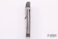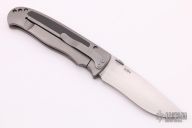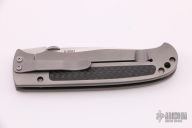 This TMX framelock folder by Tom Mayo features a hand-rubbed satin finish blade with a thumbdisc and notched thumbrest. The handle has a bead blast titanium frame with carbon fiber inlays. Bead blast titanium clip, tip down. Nice lockup, detent, and blade seating. Excellent condition.