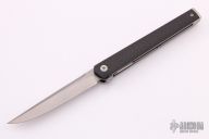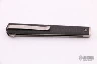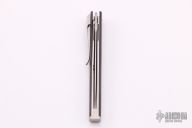This Executive Flipper by Richard Rogers features a bead blasted kwaiken style blade with elongated swedge and notched flipper. The handle is comprised of carbon fiber scales over blasted titanium liners and T-cap/backspacer. Matching hardware and tip down clip. Rogers logo milled inside the liners. Includes card dated December 2019. New from maker.