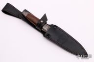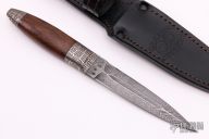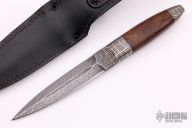 This Dagger by Olamic Cutlery features a double-edged blade with fullers and a hidden tang construction. The handle features a Damascus bolster and butt cap complemented by a wood grip. Includes a black leather sheath. Excellent Condition.