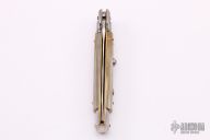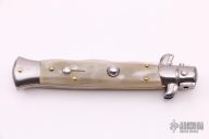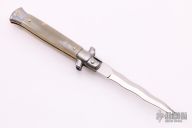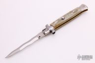 This Swivel Bolster Auto has a stainless steel Kris blade. The handle is composed of a steel front and rear bolsters, brass liners all complemented by honey horn scales. Includes a padded zippered case. Excellent Condition.