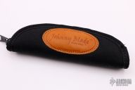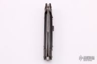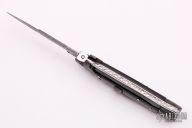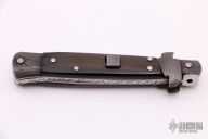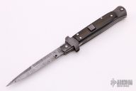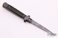 This 9" Swivel Bolster Auto by Omerta features a Damascus bayonet ground blade with false top edge. The handle has Damascus push button and bolsters, dark horn scales, file worked stainless steel liners and backspacer. Includes a padded zippered case.  Light spotting is visible on the blade/bolsters and the bolster that releases the lock is loose otherwise the knife is in good condition.