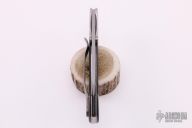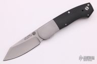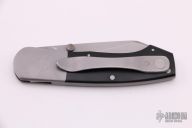 This Scott Sawby Combat Utility folder has his patented self lock system. The blade is bead blasted with dual thumbstuds. The handle has dovetailed bead blasted stainless steel bolsters with integral liners, black linen micarta scales, tip up bead blasted stainless steel clip and backspacer, clip is left/right reversible. Has some light scuffs and spots, otherwise excellent condition.