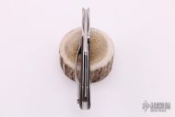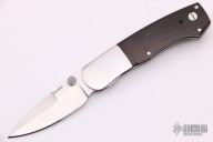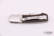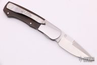 This Scott Sawby Small Combat Utility folder has his patented self lock system. The blade is satin finished with a single thumbstud. The handle has dovetailed stainless steel bolsters with integral liners, brown canvas micarta scales, tip up stainless steel clip and backspacer, clip is left/right reversible. Has some light scratches, otherwise excellent condition.