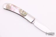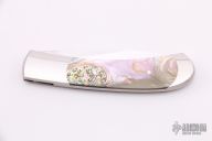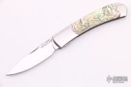This Swift model self lock folding knife by Scott Sawby features a mirror polished blade with polished stainless steel bolsters and integral liners. The handle is composed of abalone. Light scratching is visible on the bolsters, otherwise the knife is in excellent Condition. Nice action and blade seating; beautiful craftsmanship.