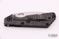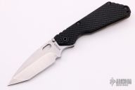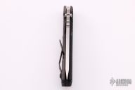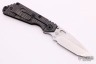 This SNG framelock folder by Mick Strider features a stonewashed tanto blade and a dimple pattern black G-10 and flamed titanium frame and tip up titanium clip. Includes a "Lock Bar Stabilizer" for maximum reverse lock retention. Nice detent, lockup and blade seating. New from maker at the CCKS.