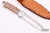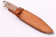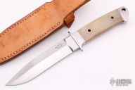 This Integral Wilderness Prototype by Dietmar Kressler features a hand rub satin finished blade with sharpened top edge, .195" blade thickness and 1.092" blade depth, integral tapered tang construction. The handle has an integral fluted satin finished guard and butt, beautiful sheep horn inlays with thin red liners, lanyard hole at the butt. Feels great in the hand. The fit and finish is exceptional. Very impressive work. Knife comes with a brown leather sheath. Excellent condition.