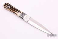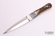 This Dagger by Herman J Schneider features a hand rubbed satin finished double-edged blade, .237" blade stock, 1.278" blade depth, full tapered tang construction. The handle has engraved and dovetailed stainless steel bolsters that were engraved by "Lynton McKenzie", stag scales with engraved stainless steel pins. Outstanding work from Mr. Schneider. Excellent condition and comes with a zippered case.