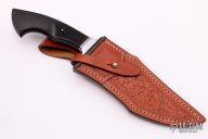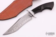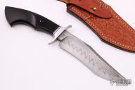 This Fighter by Journeyman Smith Ben Breda features a hand forged blade with beautiful hamon and sharpened top edge, .226" blade stock and 1.495" blade depth, hidden tang construction. The handle has a satin finished guard with nice contouring, checkered ebony grip with single domed pin, fileworked titanium spacer. Comes with a hand tooled brown leather sheath. Excellent condition. Beautiful piece.
