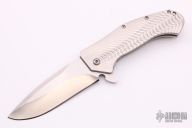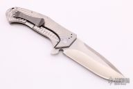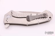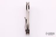 This Cerberus framelock flipper by Allen Elishewitz and Les George features a satin finished drop point blade with swedge. Milled titanium scales feature matching machined pattern, front and back. Tumbled titanium tip up carry pocket clip can be re-positioned for tip down carry. Strong lock up, nice detent and blade seating. Excellent condition. Includes a zippered case.