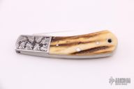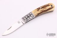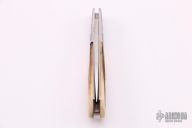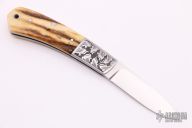 This slipjoint by the Late Bob Lum features a hand rub satin finished blade with nail nick. The handle has engraved stainless steel bolsters done by S. Lytton, stainless steel liners and spring, stag covers. Comes with a zippered case. Has a few light scratches on the spring, otherwise excellent condition.