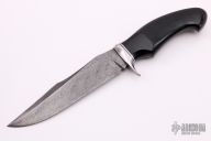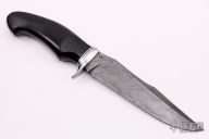 This Nemesis Fighter by Samuel Lurquin features a 3-bar Damascus blade with sharpened top edge, .233" blade stock and 1.438" blade depth, hidden tang construction. The handle has a pinched stainless steel guard and a black G-10 grip. Brilliant handle contouring. Comes with a zippered case. Excellent condition.