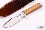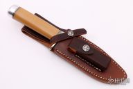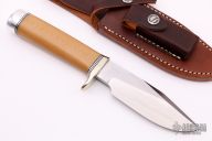 This Sergeant's Special by Randall Made Knife features a satin finished blade with sharpened top edge and a notched thumbrest, .227" blade stock and 1.380" blade depth, hidden tang construction. The handle has a nickel silver guard and rounded duralumin butt with bone linen micarta grip, black and duralumin spacers. Comes with a brown leather sheath and original paper wrapping. New from maker.