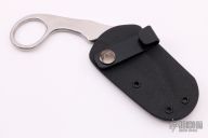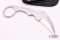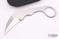 This Karambit by Crawford Knives features a satin finished double-edged blade and handle, notched thumbrest and a ring at the butt, .192" blade stock and 1.196" blade depth. Comes with a kydex sheath. Has a few light scratches, otherwise excellent condition.