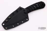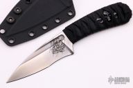 This SIN by Bastinelli Knives features a satin finish recurve blade with notched thumbrest and fullers, .147" blade stock and 1.225" blade depth, hidden tang construction. The handle has black cord wrap over black underwrap and a menuki. Comes with kydex sheath and a padded zippered case.   New from maker.