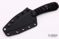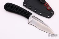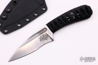 This SIN by Bastinelli Knives features a satin finish recurve blade with notched thumbrest and fullers, .147" blade stock and 1.225" blade depth, hidden tang construction. The handle has black cord wrap over Rayskin and a menuki. Comes with kydex sheath and a padded zippered case.   New from maker.