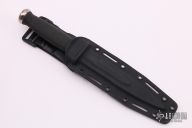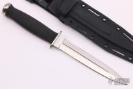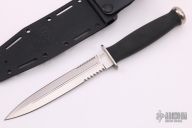 The Desert Dagger from SOG Knives features a Spear Point blade with fullers and contrasting serrations near the guard, .153" blade stock and 1.023" blade depth, hidden tang construction. The Kraton handle provides great grip and feel in the hand, stainless steel guard and pommel. Comes with original black kydex sheath. Excellent condition.