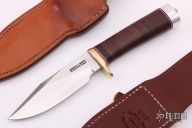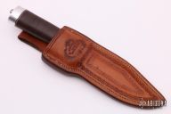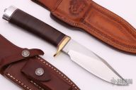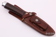 This Sergeant's Special by Randall Made Knife features a satin finished blade with sharpened top edge and a notched thumbrest, .201" blade stock and 1.301" blade depth, hidden tang construction. The handle has a brass guard and duralumin butt with stacked leather grip, red/white/blue spacers. Comes with a brown leather sheath and a custom hand tooled brown leather sheath. Also comes with a Randall Knife Pin. Has been used, has scuffs and scratches, otherwise good condition.